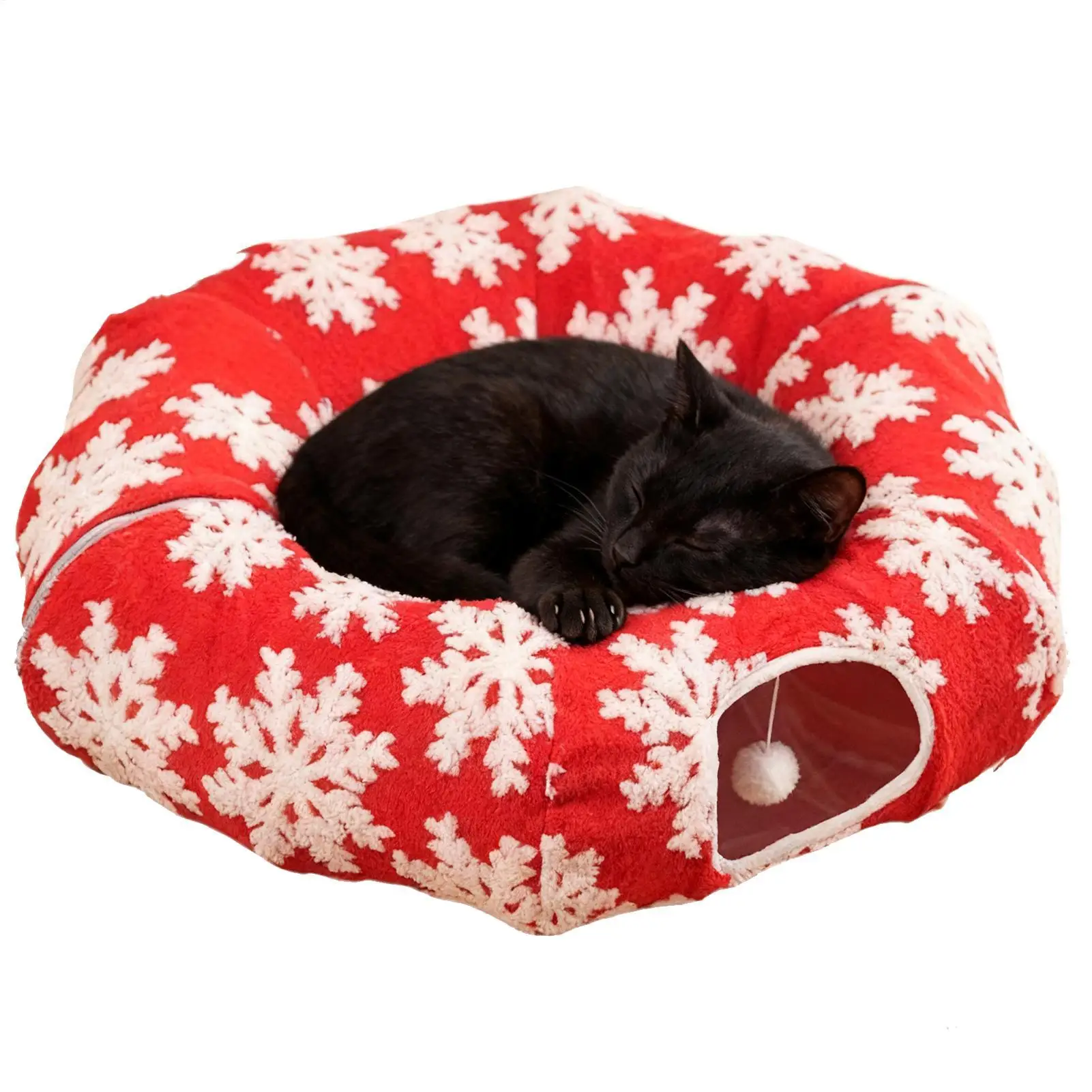 4.Relaxation Meets Festivity: This Cat Tunnel With Bed Christmas incorporates a circular bed design to create an inviting resting spot for cats, promoting calmness and comfort while doubling as a decorative piece
