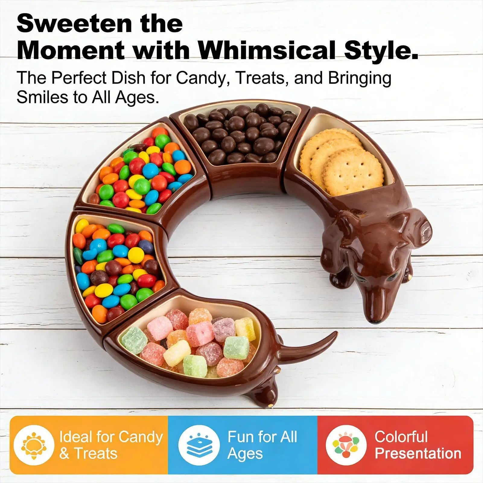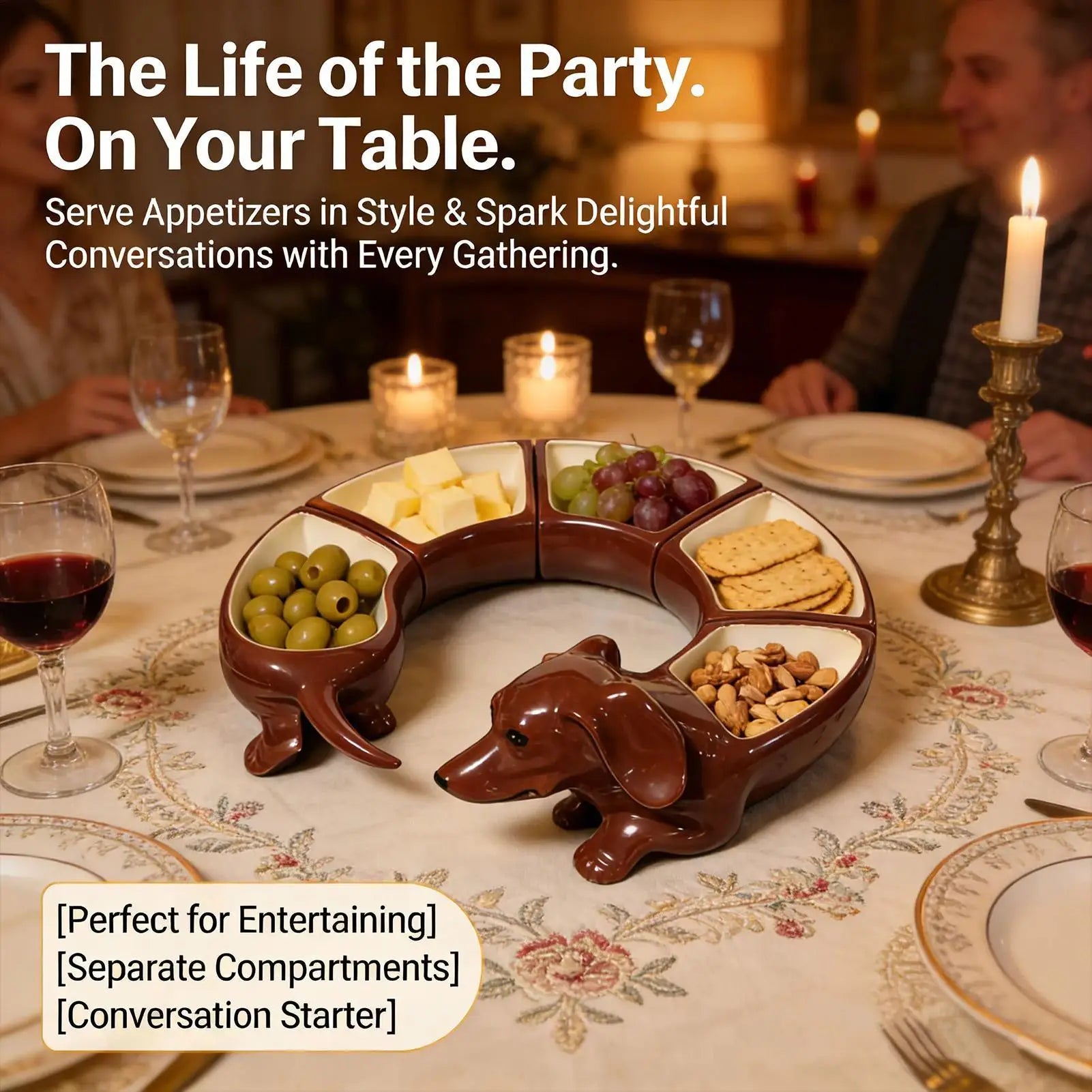 The SnackSauss™isn’t just a tray — it’s the centerpiece your table has been missing. Designed to stretch across your table likean adorable dachshund, it turns everyday snacks into a playful experience your guests instantly notice.